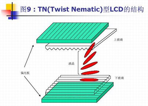 從圖10中我們可以知道, 當上下兩塊玻璃之間沒有施加電壓時, 液晶的排列會依照上下兩塊玻璃的配向膜而定. 對於TN型的液晶來說, 上下的配向膜的角度差恰爲90度.(請見圖9) 所以液晶分子的排列由上而下會自動旋轉90度, 當入射的光線經過上面的偏光板時, 會只剩下單方向極化的光波. 通過液晶分子時, 由於液晶分子總共旋轉了90度, 所以當光波到達下層偏光板時, 光波的極化方向恰好轉了90度. 而下層的偏光板與上層偏光板, 角度也是恰好差異90度.(請見圖9) 所以光線便可以順利的通過, 但是如果我們對上下兩塊玻璃之間施加電壓時, 由於TN型液晶多爲介電係數異方性爲正型的液晶(ε// >ε⊥ ,代表著平行方向的介電係數比垂直方向的介電係數大, 因此當液晶分子受電場影響時, 其排列方向會傾向平行於電場方向.), 所以我們從圖10中便可以看到, 液晶分子的排列都變成站立著的. 此時通過上層偏光板的單方向的極化光波, 經過液晶分子時便不會改變極化方向, 因此就無法通過下層偏光板.