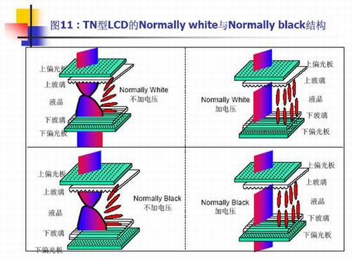 所謂的NW(Normally white),是指當我們對液晶面板不施加電壓時, 我們所看到的面板是透光的畫面, 也就是亮的畫面, 所以才叫做normally white. 而反過來, 當我們對液晶面板不施加電壓時, 如果面板無法透光, 看起來是黑色的話, 就稱之爲NB(Normally black). 我們剛才所提到的圖9及圖10都是屬於NW的配置, 另外從圖11我們可以知道, 對TN型的LCD而言, 位於上下玻璃的配向膜都是互相垂直的, 而NB與NW的差別就只在於偏光板的相對位置不同而已. 對NB來說, 其上下偏光板的極性是互相平行的. 所以當NB不施加電壓時, 光線會因爲液晶將之旋轉90度的極性而無法透光. 爲什么會有NW與NB這兩種不同的偏光板配置呢? 主要是爲了不同的應用環境. 一般應用於桌上型電腦或是筆記型電腦, 大多爲NW的配置. 那是因爲, 如果你注意到一般電腦軟體的使用環境, 你會發現整個螢幕大多是亮點, 也就是說電腦軟體多爲白底黑字的應用. 既然亮著的點占大多數, 使用NW當然比較方便. 也因爲NW的亮點不需要加電壓, 平均起來也會比較省電. 反過來說 NB的應用環境就大多是屬於顯示幕爲黑底的應用了.
