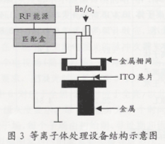 等离子体通常使用图3所示的设备进行工作。将基片放在底座上,在真空系统中通入不同的混合气体,并在金属电极上家射频电压将气体电离,形成等离子体,以非常快的速度轰击ITO基片。为了形成较均匀的电场,电极采用金属栅网结构。等离子体的作用通常是改变表面粗糙度和提高功函数。研究发现,等离子作用对表面粗糙度的影响不大,只能使ITO的均方根粗糙度从1.8nm降到1.6nm,但对功函数的影响却较大。用等离子体处理提高功函数的方法也不尽相同。氧等离子处理是通过补充ITO表面的氧空位来提高表面氧含量的。氧同表面有机污染物反应生成CO2和H2O,去除了表面有机污染物。SF6通过在ITO表面形成一层含氟层来提高表面功函数,对粗糙度的改变不明显。Ar等离子处理是通过除区在装载基片过程中吸附的氧来清洁ITO表面的。