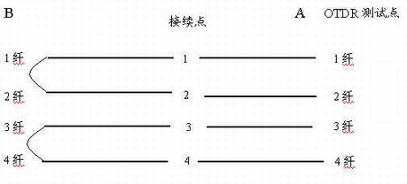4、 接续点在熔接好第2纤后,测试点从A至B并经环回后变为B至A方向监测第2纤的B至A的反向损耗值,并记录m2反