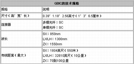 下表给出了安装在千兆位以太网端口上的GBIC的布线规格。请注意,所有的GBIC端口都使用SC型连接器,所有列出的GBIC(多模和单模光纤)的最小布线距离为6.5英尺(2米)。