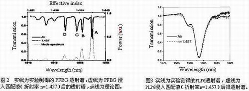 传统光纤光栅的包层谐振波是在空气硅界面上相干反射形成,如果光栅所处的外界环境发生变化,则其传输谱亦随之改变。虽然这种效应可以用来测量外部折射率、浓度等物理量;但是在测其它参量时,往往需要剔除外界环境变化因素,即需要具有对外界折射率不敏感的性质光纤光栅器件。在文献[9]中,该作者把PCFG浸入折射率n=1.457的匹配液中,其透射谱几乎不变,如图2(a)、3中的虚线所示。他们的实验表明:PCFG高阶泄露模基本不受光纤外部折射率的影响,写入的PCFG滤波性质由光纤横截面的气孔周期阵列结构及填充物的属性所决定,即PCFG对外界折射率具有良好的不敏感性质。我们认为,这主要是由于PCF的空气包层结构造成的:光波由纤芯耦合进入包层,当传播抵达内硅层与空气之间的界面时发生反射;这样包层模被局限在纤芯与周围最近的空气孔之间,基本没有能量的泄漏,即外界环境的变化不会影响其传输特性。这种对外界折射率不敏感的性质,用在传感领域可以剔除外界扰动因素,从而获得高精度的测量结果;用在通信领域则可使系统在不同环境下,如海洋、水库、油田等,保持光的传输性质不变。