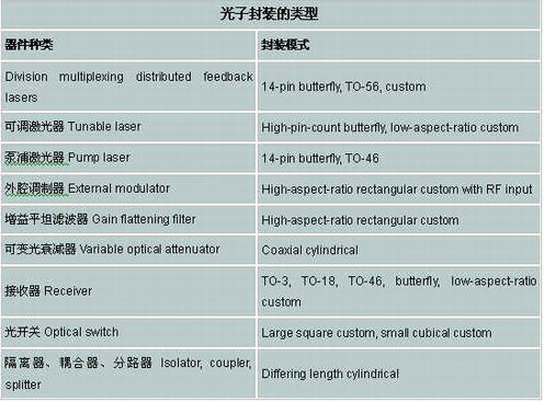 通常器件功能支配着封装模式。高性能的器件,例如激光光源、泵浦激光器及调制器,一般会组装在蝶式封装中(butterfly packages)。低性能、较短距离与对成本相当敏感的器件则采用低成本的封装模式,如圆柱式(Transistor-Outline, TO)封装TO-46及TO-56(图2)。而表1则列出了不同器件所采用的不同封装模式。