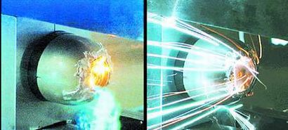 山本向记者展示了几摞碳钢板和铝板,每个都有2英寸高、1英寸厚,所有的金属板上都有烧灼而成的窟窿。其中一摞金属板上标着“6-6-05”的数字,因为烧出了半美元纸币大小的窟窿而弯向一边,山本用绳子把这些带窟窿的板串在了一起。这样的成果似乎让山本十分满意。“你能相信吗?”他边乐边问,好象捡到了宝贝的大男孩儿,实际上他已经50岁,“就象一道闪电一样,这些东西就融化了,简直难以想象。”