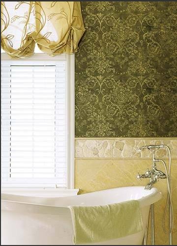 窗与帘的对话 在浴室中,窗户必须配有窗帘,否则灯光会让外人对室内一览无余。百叶窗虽然能够在很大程度上避免这种尴尬,但在视觉上会显得平淡。选择一款优雅的罗马帘,就像给窗配了一个极美的像框,而窗外变化的景致则是一张风景照片。
