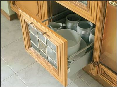 抽屉与地柜比较起来,也是价格较高的选择,所以建议选择一组抽屉即可。作为普通家庭而言,日常用碗、盘大概有70件左右,分3至4层放置足够。底层抽屉可做成高屉板、低帮儿的专用锅屉,炒锅、大小铝盆都可以放在里面。如果橱柜设计师向你疯狂建议多来几组抽屉,如果你家不是经常搞聚会,一定要拒绝。除了碗、盘、锅,其他的厨房物品是不适宜放置在抽屉里的,而一般家庭的这些器皿数量有限,没必要多花钱添置不必要的花哨东西。
