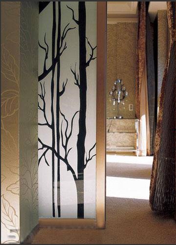 在局部用喷砂技术处理过的玻璃推拉门不仅增加了私密性,还具有一定的装饰性。